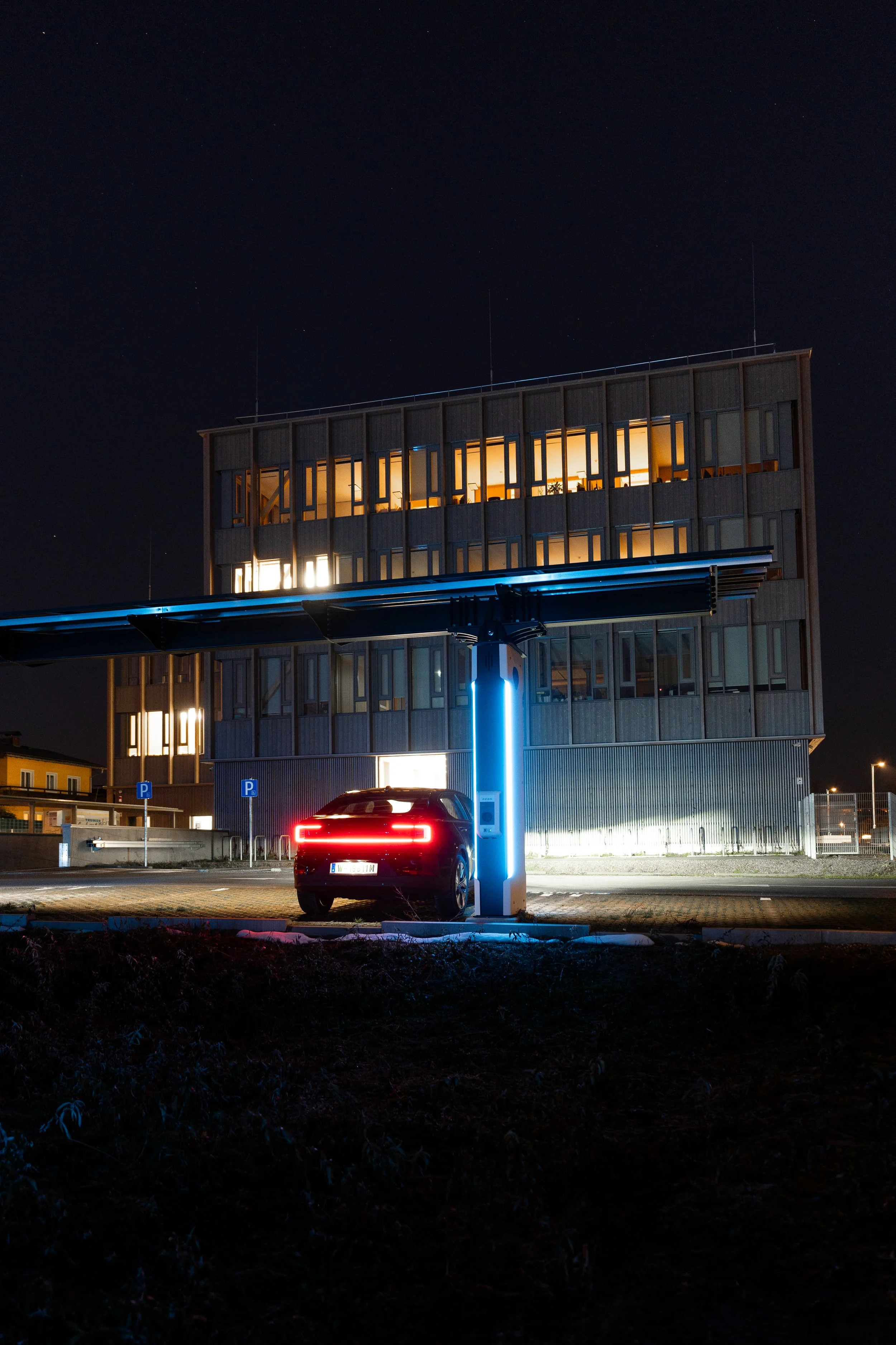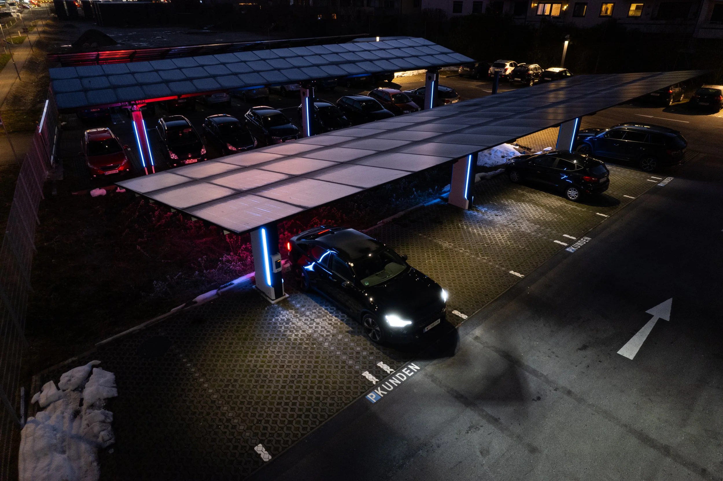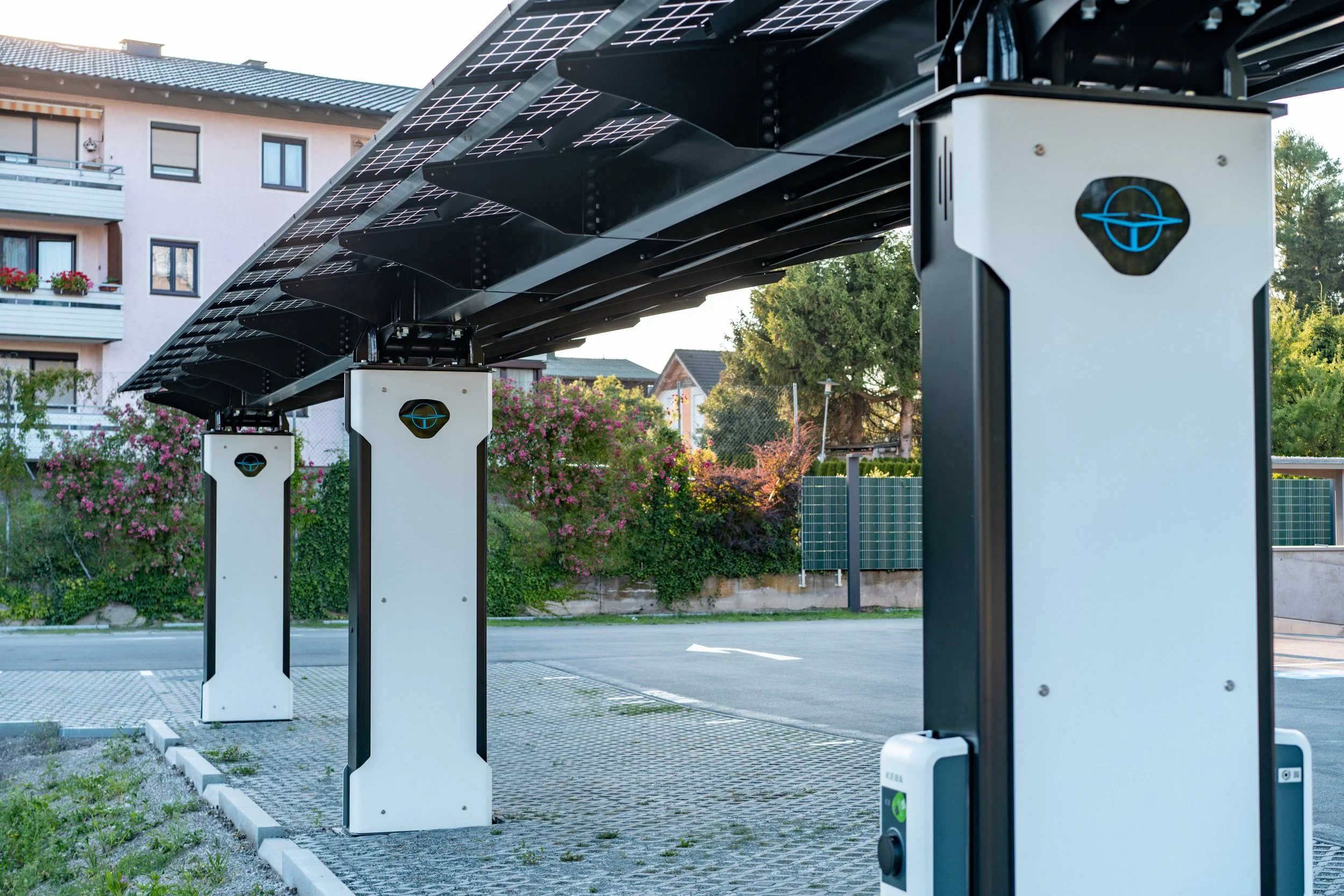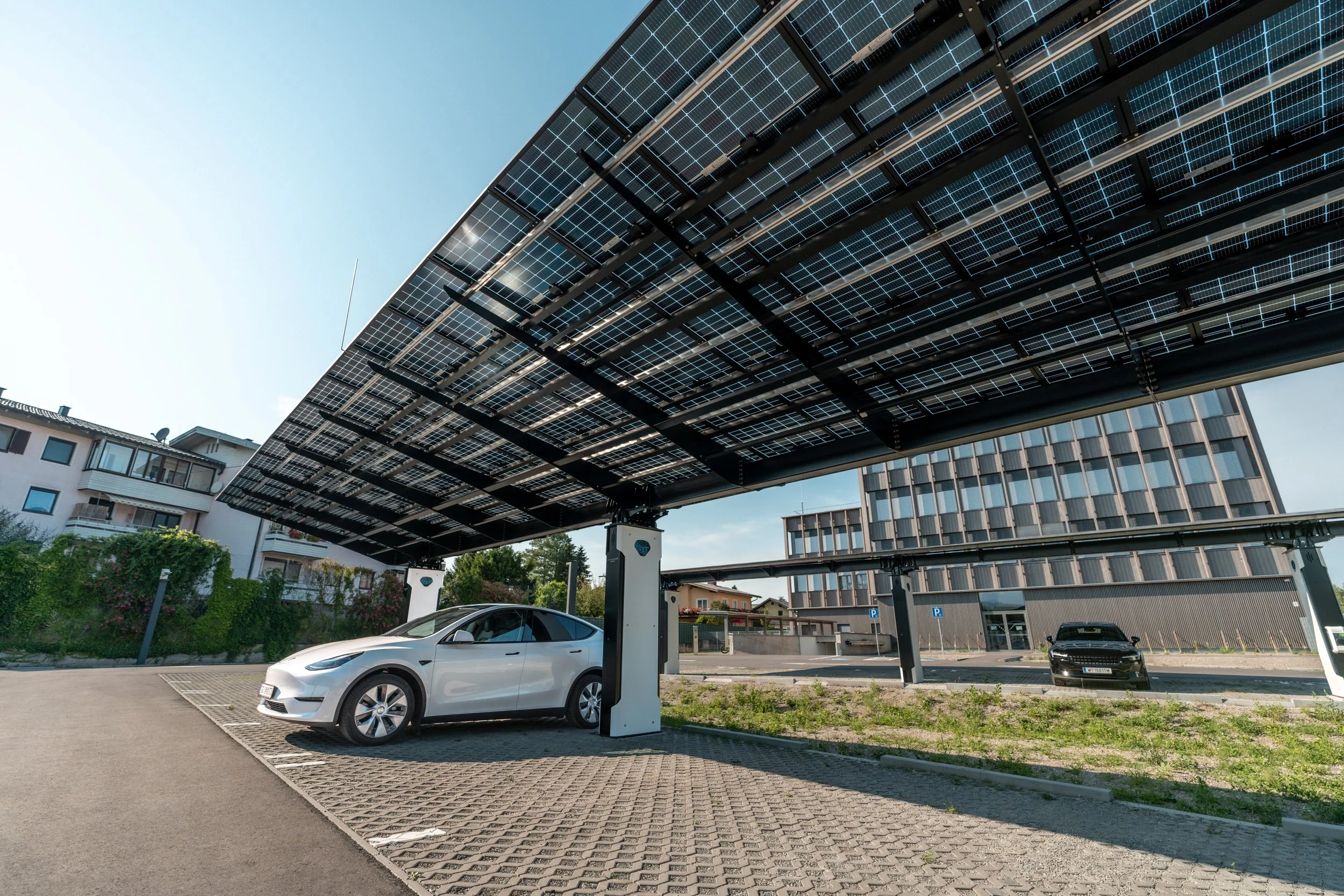 Für die neue Bezirkshauptmannschaft für Salzburg Umgebung in Seekirchen bei Salzburg wurden drei PV-Carports vom Typ VOLTWING C5 mit jeweils 21 Metern Länge errichtet. Drei der 9 Säulen sind mit Ladetechnik ausgestattet - der Rest ist hierfür vorbereitet.